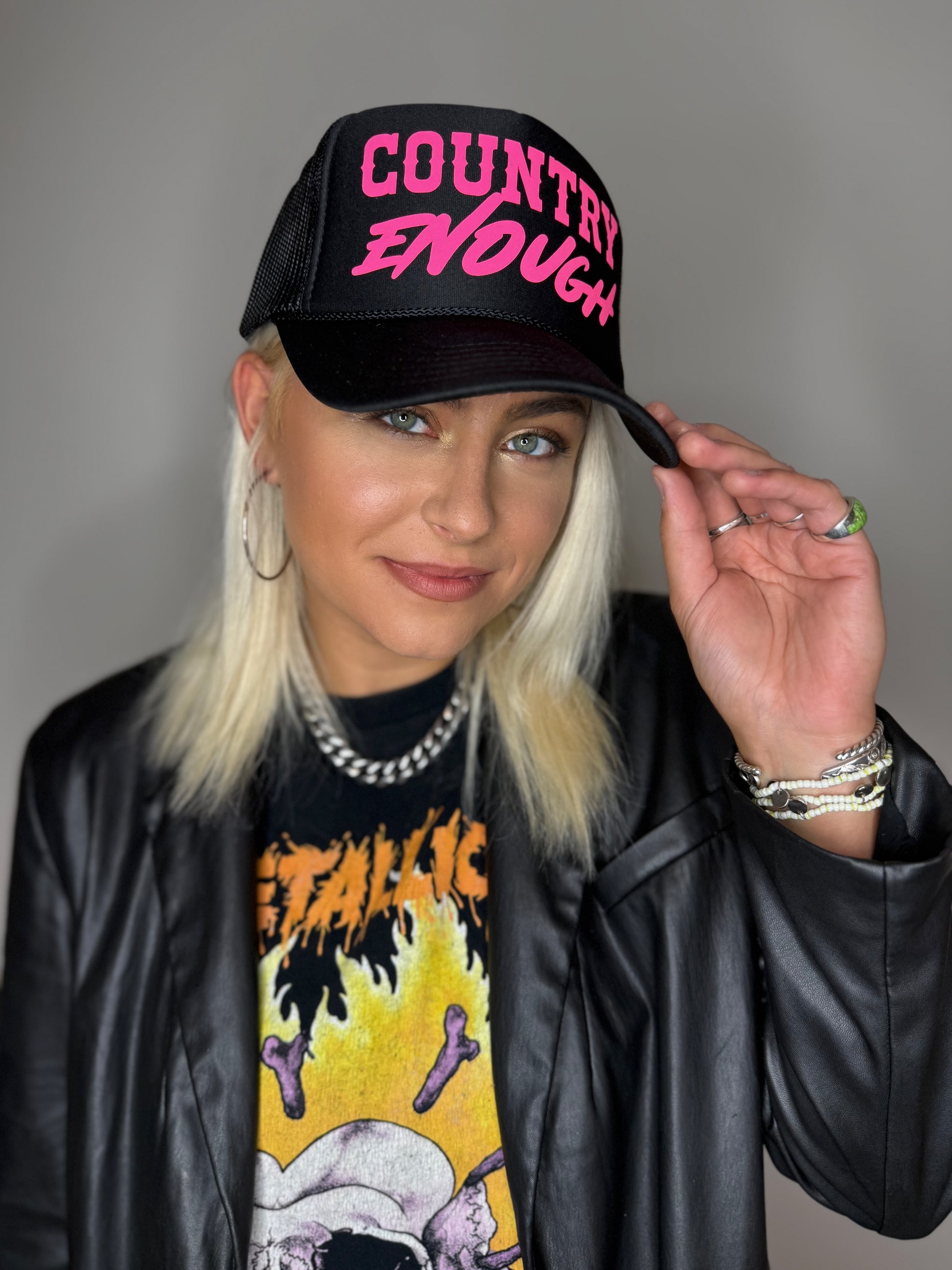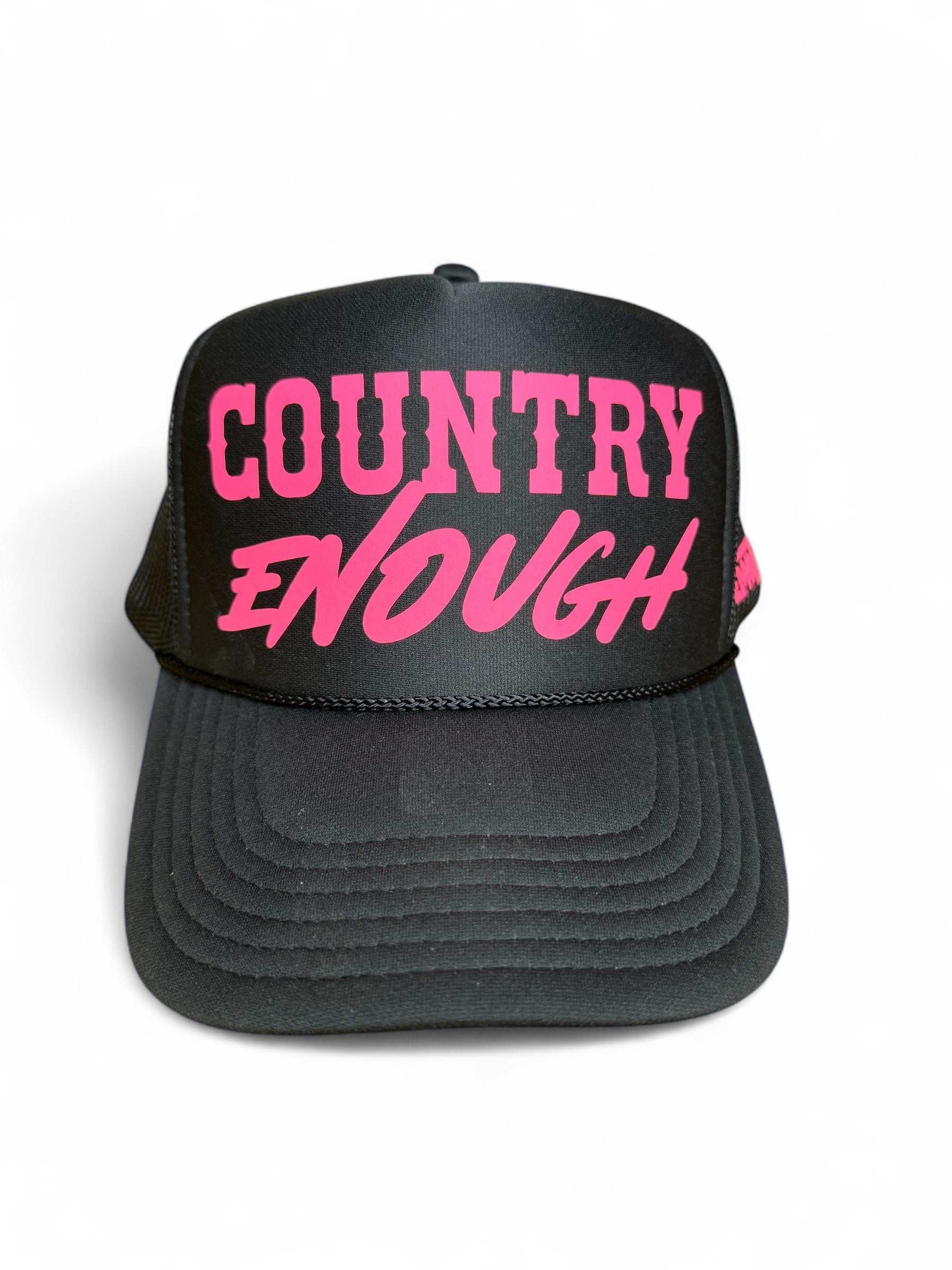 Classic black Otto foam hat with a hot pink reflective Country Enough logo